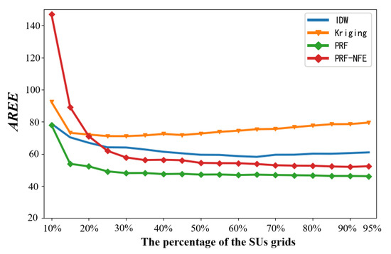 The average REMs estimating errors of the PRF and the PRF-NFE decrease with the increase of the number of secondary users gradually in Figure 13. The above testing results demonstrate that the more PS from the sensing nodes, the better the reconstruction performance from the PRF algorithm. In the range of 10% to 95%, the PRF algorithm has a better estimation results than the PRF-NFE, IDW and Kriging algorithm.