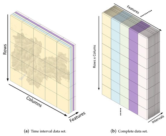 To analyze the entire data set, including all intervals, the information is organized in several data cubes of the same area during a period of time, as is shown in Figure 1b, allowing us to perform a set of experiments through the period of time recorded.