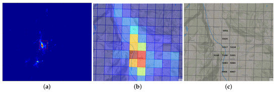 Panel (a) shows the classification map resulted after the Euclidean distance classification process over one interval of the data set. Panel (b) shows the urban area of Trento which has been zoomed in order to appreciate the difference between urban areas and rural areas within this interval. Panel (c) shows the cell identification in the city center of Trento. (a) Classification map of the Trento province; (b) Projection of the city center of Trento classification; (c) Cell identification of the city center of Trento.