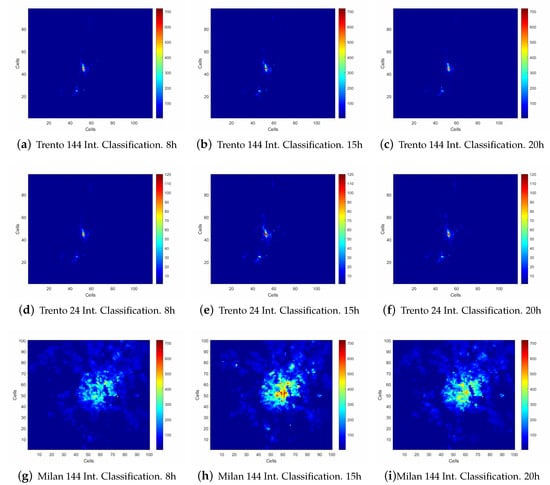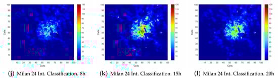 The description made for the network usage is fine-grained for every cell, but the number of classes that classifies the data set in a single day could be considered too high. In order to provide a better solution to this issue, a reduction in the time component is performed grouping the intervals hourly. This process reduces the number of classes from 720 to 120, shorting the complexity of the problem as is shown in Figure 3d–f, which depicts the Trento province classification, and Figure 3j–l, which describes the comportments classified in the area of Milan. A comparison between images, assures that by using the 144 interval classification the information displayed is clearer and variations between similar network usage profiles can be depicted by the oscillation in the color of the class.