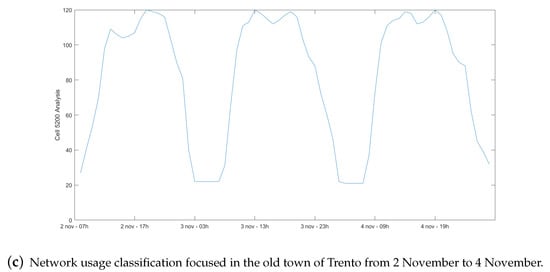 Using the new cluster set, it is easier to describe the whole Trento province data set and analyze the comportments as shown in Figure 4a. In the figure, the evolution of the comportment of the cells in time is described. As could be observed, the lower level network profile corresponds with the rural area which does not modify the comportment over time. At around cells 5000–5300, the cells are classified as the higher network usage comportment of the data set. These cells correspond with Trento downtown (Figure 2c) and describe the comportment of the city during the two months analyzed. Figure 4b zooms to the aforementioned cells analyzing various days. The comportment follows a day–night pattern [17] distinguishing the differences between day and night periods. Particularly, the analysis of a single cell, located in the old town of Trento, shows that this cell registers one of the highest network usage profile of the data set. The evolution of the comportments in this cell are shown in Figure 4c. As expected, a day–night pattern is visible from 7:00 h to 20:00 h, being around 15:00 h the highest network usage. Comparing this metropolitan area with a rural one, even the lowest usage profile is classified in the metropolitan area, and it can be observed that the usage of the network is higher than in the rural area. It is also possible to observe that on weekends the network usage trend remains but stays at higher levels until 22:00 h [10].
