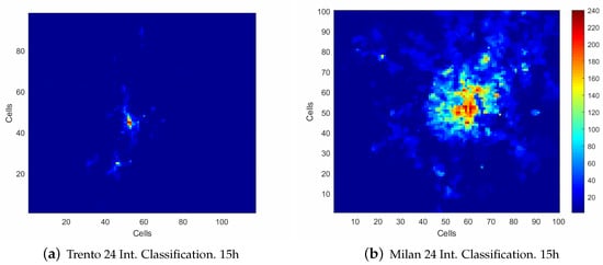 The analysis process started using the same methodology as presented in [15], choosing the same date (Thursday, 14 November 2013) for Milan and the Trento province data sets. On this date, various intervals (8:00 h, 15:00 h and 20:00 h) have been analyzed to cover different network behaviors during the day. Each day in the data set is divided into 144 intervals of 10 min obtaining five characterizing vectors from each. A set of classes is extracted from each interval, and in order to make a fair daily classification, the vectors obtained are combined to create a single set of 720 classes, which represent all the comportments in the selected date, following Equation (2),