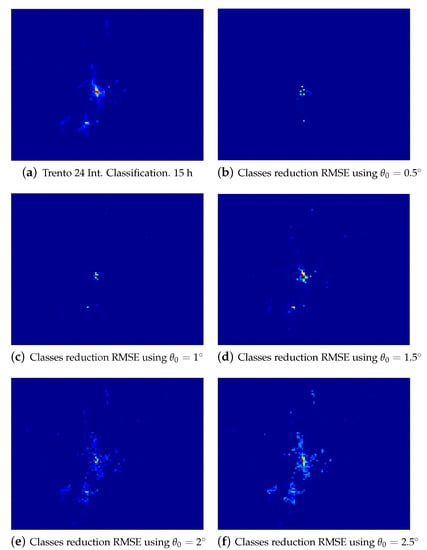 Figure 6a depicts the original classification of the Trento province at 15:00 h in order to have a reference for the error maps displayed from Figure 6b–f. These figures show the approximate error in the cells, classifying the data using the original set of comportments or by means of the reduced one. It can be seen how the urban areas have higher error values as we increase the threshold value , as there exist cells where the network behavior varies more. Table 1 shows the mean RMSE value obtained along with the number of classes reduced in the cluster set. As could be observed with in Figure 6b, the number of classes is reduced from 240 to 179, this means that around 25% of similar comportments are unified. When the value of is set to 1.5° it already begins to affect areas outside the center of Trento. Conversely, Figure 6f sets the number of classes to 27, an almost 90% of reduction, corresponding an important loss information in the key areas. The RMSE value obtained using different thresholds up to 2.5° implies that most of the comportments are located in the Trento city area and also the proximity between comportments is in the range of tenths of a degree. Finally, the number of extracted comportments from the Milan data set is around 50% in every reduced comportment set, as shown in Table 1. This means that there are some comportments found in the Milan data set, which describes the metropolitan and suburban areas, that are similar in the Trento province data set which defines a bigger zone, mainly rural.