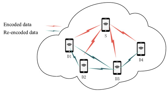 In the wireless multi-hop multicast network, as shown in Figure 1, source node S encodes the data that needs to be transmitted and then sends it out through a multicast connection. The destination nodes perform re-encoding operations after receiving part of the data, and then send the re-encoded packets to the surrounding nodes. To recover the original data, the mobile devices working as destination nodes only need to receive a certain number of linearly independent packets.