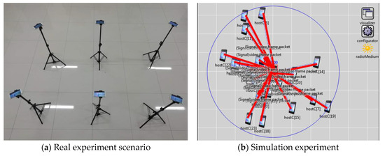 Because the D2D communication module hasn’t been implemented in commercial mobile devices at the current stage, we used the WiFi Direct technology to implement device-to-device communication between different devices. In the experiment, the video transmission is conducted in the form of a UDP multicast by adopting the IEEE 802.11g protocol. The experimental scenarios for this scheme are shown in Figure 2.