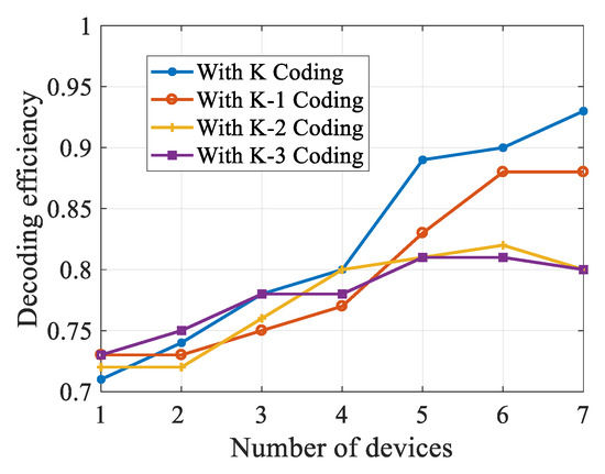In Figure 4, we observe that the best performance can be achieved when the nodes conduct the re-encoding operation after receiving the complete data because the packets obtained after re-encoding will be more useful. If the nodes conduct re-encoding operation after receiving partial data when other nodes receive the re-encoded packet, they need to check whether the re-encoded packet is linearly independent to their packets, which will increase the decoding delay. Furthermore, if the re-encoding operation is conducted after receiving partial data, it will increase the nodes of re-encoded data slices, which will cause channel jam and significantly reduce the transmission efficiency. According to the diagram, it can be seen that if the re-encoding operation is conducted after receiving complete data, the SDR will decrease. Therefore, we choose to conduct a re-encoding operation after the destination node has received K packets.