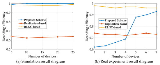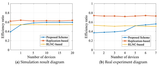 In accordance with Figure 10, no matter in the simulation experiment or real experiment, the replication-based scheme has the highest utilization. This is because the scheme does not perform redundant operations, but the video transmission quality is deficient in this case. The proposed scheme in the initial phase is slightly lower than the traditional scheme based on RLNC. With the increase in the number of mobile phones, the utilization rate of our scheme slowly improves and soon outperforms the traditional RLNC scheme.