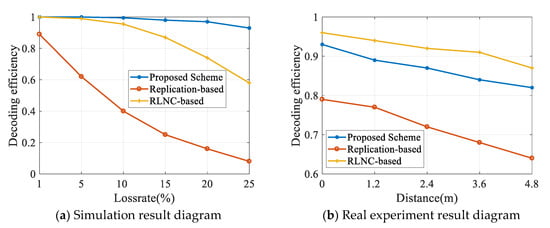 In the real scenario, the destination nodes are not always next to the source node, and different distances will lead to different packet loss rates. Therefore, we must consider the effect of distance on wireless data transmission. To this end, we have also conducted corresponding experiments. We performed simulation experiments on the performance of the three schemes under different packet loss rates and conducted real experiments on the effect of distance on the SDR. The results are shown in Figure 6. In the simulation experiment, the number of mobile devices is 25, and the redundancy value of RLNC scheme and the replication-based scheme is set at 3. From the simulation experiment diagram, we observe that the SDR of the three schemes decreases to varying degrees with the increase of the packet loss rate. The scheme proposed in this paper has a tiny decline, the RLNC-based scheme has a moderate decline, and the replication-based scheme has a significant decline. The solution in this paper can still maintain a very high SDR under high packet loss. Therefore, it can be proved that the proposed scheme has the most robust anti-interference ability.