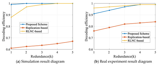 In Table 3, all delays are average delays. The delays caused by the reading operation are consistent; the replication-based transmission method does not have any encoding delay; the scheme proposed in this paper requires two milliseconds less encoding time than the RLNC-based scheme. During the transmission process, the RLNC-based scheme has the most prolonged delay. During the decoding process, the replication-based method takes the least time, which only requires 9 ms; our proposed scheme requires 11.5 ms; the RLNC-based scheme takes 11.1 ms. In general, the replication-based transmission method has the shortest delay, while the RLNC-based transmission method involves the most prolonged delay. Compared with the traditional RLNC-based scheme, our proposed scheme can reduce codec delay by about 8%.