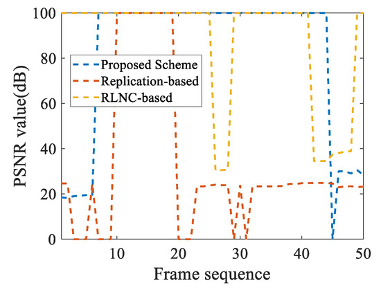 The quality of the video is an essential criterion for testing the reliability of transmission, so it needs to be focused on experiments. In the experiment, we analyze the video quality of the three schemes with PSNR as the criterion, as shown in Figure 9. PSNR is a primary video quality evaluation indicators, and its value ranges from 0 to infinity. The PSNR value indicates the degree of distortion of the picture. The larger the value is, the smaller the distortion is. Generally, when the PSNR value is higher than 50, it means that the picture quality is excellent. We consider that the picture is almost completely restored when the PSNR value exceeds 100. So we set all values higher than 100 to 100. Moreover, when the data frame is lost, the PSNR value is set to 0. Therefore, in the figure, the value of PSNR ranges from 0 to 100.
