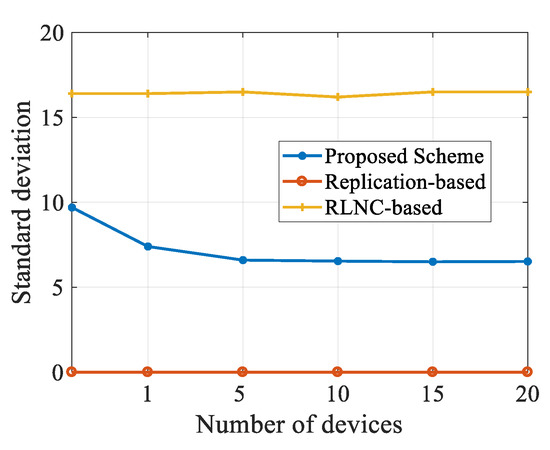 In the experiment, we calculate the increased load of encoding and decoding. Because the replication-based scheme has no codec operation, the load value of this scheme is always zero. From Figure 11, the average load value of the nodes in our scheme is only half that of the RLNC-based scheme, and this is because the redundant operations of the source nodes are reduced. Besides, as the number of nodes increases, the standard deviation of our scheme declines.