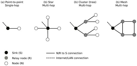 A SN structure can be abstracted into a composition of a set of nodes and a sink node (more simply the sink, also called gateway. A node collects information, performs pre-processing and transmits the produced data to the sink. The sink collects all the data from the nodes and transmits them to servers for storage and further processing. On the basis of this simple architecture, many variants can be designed, depending on the needs and targeted applications, each variant giving rise to specific technical constraints. Among the most common variants are the following [40] (Figure 1):
