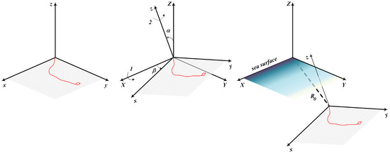 In what follows, we will operate two coordinate systems. The first one is the coordinate system in which the target motion can be defined as a planar maneuver, and the second one is the coordinate system in which the observations are collected and the estimate is calculated. We call the former “target coordinate system” and the latter—“observer coordinate system” . Both systems are stationary, and the translation from one system to another is given by two Euler angles and and the shift vector (see Figure 1).