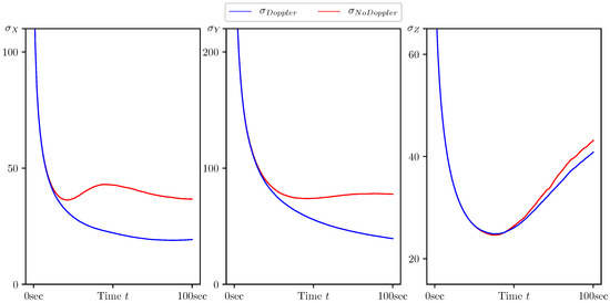 Standard deviation of estimation error for the coordinates calculated by CMNF filter with and without Doppler measurements.