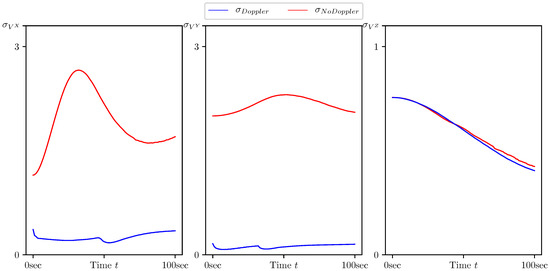 Standard deviation of estimation error for the target velocity components calculated by CMNF filter with and without Doppler measurements.