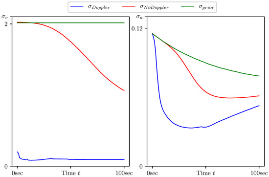 Standard deviation of estimation error for the target heading speed and normal acceleration calculated by CMNF filter with and without Doppler measurements, and their a priori estimates.
