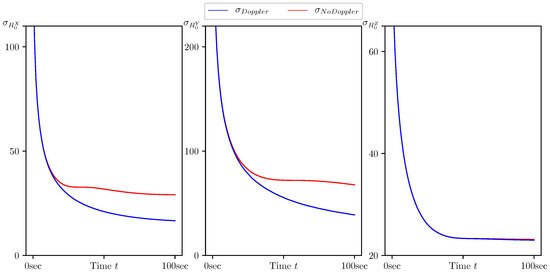 In Figure 5, Figure 6, Figure 7, Figure 8 and Figure 9, the standard deviations for the parameter estimation errors are presented with respect to the time variable , s. Table 1 shows little or no difference between the results for Basic CMNF, CMNF LS Doppler, CMNF ML Doppler filters, and between the results for CMNF LS and CMNF ML filters on the last step. The analysis of the collected data shows that all CMNF filters with Doppler measurements demonstrate almost the same behavior at all other time instants as well. Thus, in the following figures, the Basic CMNF, CMNF LS Doppler, and CMNF ML Doppler estimation error standard deviations are shown by the same line . The same is true for the CMNF filters based on the bearing observations only, so the CMNF LS and CMNF ML estimation error standard deviations are also depicted by the same line .