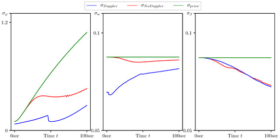 Standard deviation of estimation error for the target heading and coordinate system rotation angles calculated by the CMNF filter with and without Doppler measurements, and their a priori estimates.