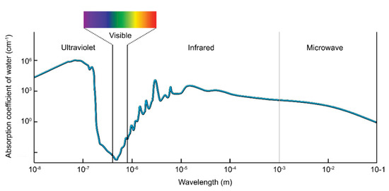 The water absorption coefficient was exhaustively measured with high accuracy from 300 nm to 700 nm, showing a minimum between 400 nm–500 nm [56,57,58,59,60]. Figure 2 illustrates the absorption coefficient of light in pure seawater.