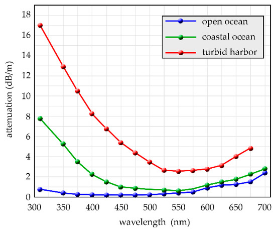 As said, underwater the light shows less attenuation in the blue/green wavelength range. However, although light attenuation in seawater is minimum in the blue-green region, the optimal wavelength for underwater optical link is conditioned from the inherent optical properties of the water, which can largely vary in different geographic places. Figure 3 shows typical attenuation (dB/m) versus wavelength for various ocean waters [50,84].