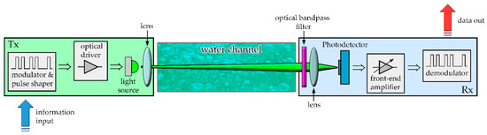 A UOWC link can be schematized in three parts, the transmitter unit, the water channel and the receiver module. The schematic in Figure 4 shows the components of a typical system.