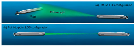 In underwater optical communication, the connection between transmitter and receiver can be of two main types (see Figure 5) [20,51]: (a) diffuse line-of-sight (diffuse LOS) configuration; (b) point-to-point line-of-sight (LOS) configuration.