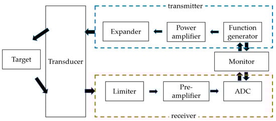 Figure 1 shows a simplified block diagram of the typical ultrasonic system []. The front-end transceiver (power amplifier, expander, preamplifier, limiter, and analog-to-digital converter (ADC)) in an ultrasonic system plays an important role in determining system sensitivity []. The expanders and limiters reduce unnecessary ring-down of the signal and block unwanted high voltage pulses []. The ADC processes the signal digitally for each image, and echo signals generated by the ultrasound device are processed and transmitted to the monitor.