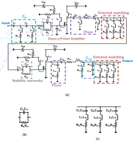 (a) Schematic diagram of a class-J power amplifier with a resistor divider; (b) the stability networks; (c) external matching–component short circuit above third harmonics.