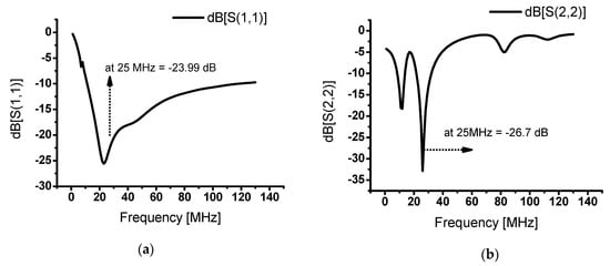 Figure 4 shows the S-parameter simulation data of the designed class-J power amplifier. The S-parameter values such as S(1,1) or S(2,2) less than −10 dB at a specific frequency suggests well matched input or output ports [,,]. The S(1,1) and S(2,2) parameters are input and output reflection coefficient S-parameters [,]. These data indicate whether the input and output at the input and output ports are well matched for a specific frequency band []. Figure 4a shows the input reflection coefficient S(1,1), which was designed as −23.99 dB at 25 MHz. Figure 4b shows the output reflection coefficient S(2,2), which was designed as −26.71 dB. The S(2,1) is related to the power gain of the power amplifier []. Figure 4c shows the transfer coefficient S(2,1), which was designed to be 32.82 dB at 25 MHz. Therefore, this simulation data confirmed that the best performances were achieved at 25 MHz.