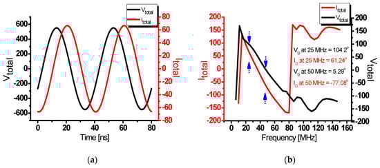 Figure 5a shows the voltage (Vtotal) and current (Itotal) waveforms of the drain over time. The voltage and current waveforms with phase difference were measured. Figure 5b shows the phase differences over the frequency band. A phase difference of approximately 43° was shown in the 25 MHz fundamental frequency, and a phase difference of approximately 82.4° was measured in the 50 MHz second harmonic frequency. The phase difference of the fundamental frequency load of an ideal class-J power amplifier is 45° [,,]. The phase difference of the second harmonic load is 90°, so it was designed to be close to these values.
