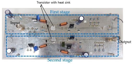 Figure 6 shows the printed circuit board (PCB) of the class-J power amplifier composed of two-stage. Power resistors, high-power choke inductors, and electronic capacitors were used to function fully in high voltage environments.