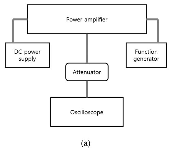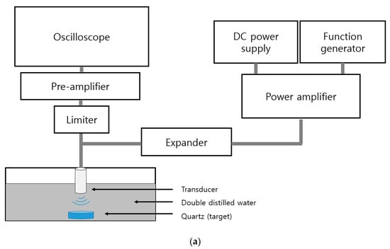 As shown in Figure 11a, a DC voltage was applied to the gate and drain through the DC power supply, and the frequency and input voltage were changed through the function generator. The water tank was 80% filled with double distilled water, which is similar to the blood in a person’s body [,,]. The signal was amplified by the power amplifier and 100% reflected by the quartz target through the transducer in the water tank. The reflected ultrasonic signal was amplified by the pre-amplifier and measured by the oscilloscope. Figure 11b shows the circuit model of the expander and limiter. The limiter was connected in parallel with a pair of diodes and a resistor to protect the oscilloscope and pre-amplifier by removing high voltage signals []. The expanders had a pair of diodes connected in series to reduce the ring-down of the signal [,].