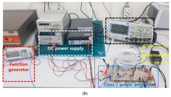 Figure 7a,b shows the experimental evaluation method used to measure the power gain and power efficiency of the class-J power amplifier itself. In the function generator, a 5-cycle sinewave was generated with respect to the operating frequency or amplitude of the input voltage. The pulse repetition interval (PRI) is 10 ms. To prevent damage due to overvoltage of the oscilloscope, we used a 100 W, 40 dB attenuator. External coolers and heat sinks were also used to obtain accurate measurement data. In Figure 8, the power gain, power efficiency, and output voltage were measured as a function of input voltage and frequency.