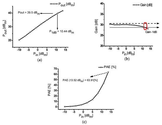 The power added efficiency (PAE) of two-stage class-J power amplifier can be obtained by subtracting the input power (PIN) from the output power (POUT) and dividing the result by the DC power consumption (PDC) []. Through Equations (9) and (11), the PAE of the designed class-J power amplifier can be derived as shown in Equation (13) [].