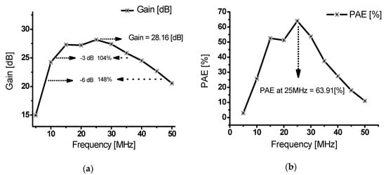 Figure 9a shows the power gain versus frequency at an input of 3 VP-P. The gain was measured at 28.16 dB at the center frequency of 25 MHz. In addition, the bandwidth at −6 dB was 148% and the bandwidth at −3 dB was 104%. Figure 9b shows the PAE versus frequency at an input of 3 VP-P. At the center frequency of 25 MHz, the PAE was highest, at 63.91%. Table 3 shows the input frequency, measured output power, measured power gain and PAE.