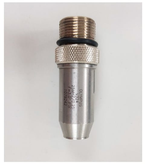 Pulse-echo experiments are a basic indicator of the performance testing ultrasonic components or systems, including ultrasonic transducers [,,]. Ultrasonic waves were generated by applying an electrical signal to a transducer with a piezoelectric effect []. The electrical signal from the transducer was detected based on the wave reflected from the target. In this paper, ultrasonic experiments and measurements were performed using a 25 MHz transducer as shown in Figure 10. A single element transducer provided by Olympus (Shinjuku-ku, Tokyo, Japan) was employed for the pulse-echo test.