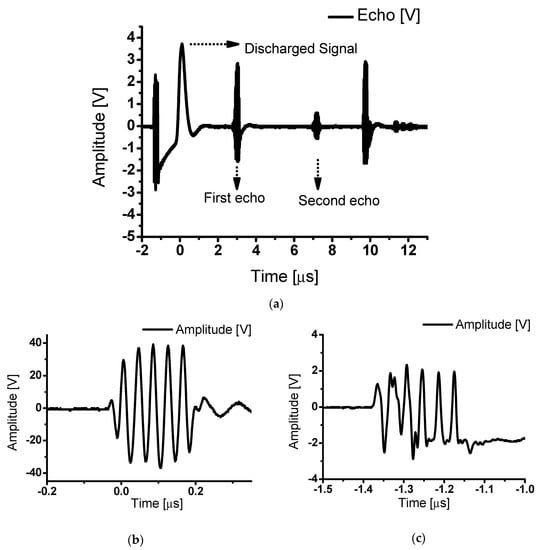 Class-J power amplifiers boast a high output power by delivering the load as a component of the fundamental and second harmonics. Figure 13a shows the first echo signal with 4.4 V amplitude and 512 ns pulse width. Figure 13b shows a second echo signal with 1.08 V amplitude and 512 ns pulse width. Figure 13a,b show that the echo signals have very high outputs.