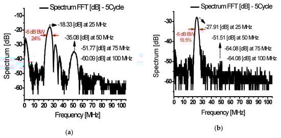 Figure 14a shows the FFT for the first echo signal as shown in Figure 13a. The fundamental, second, third, and fourth harmonic components were measured as −18.33 dB at 25 MHz, −35.08 dB at 50 MHz, −51.77 dB at 75 MHz, and −60.09 dB at 100 MHz. With the fundamental signal and second harmonics, the harmonic content above the 3rd order was significantly reduced. After converting the dB value into voltage, the calculated THD was −13.02 dB (22.35%). Figure 14b shows the FFT for the second echo signal as shown in Figure 13b. The fundamental, second, third, and fourth harmonic components were measured as −27.91 dB at 25 MHz, −51.51 dB at 50 MHz, −64.08 dB at 75 MHz, and −64.08 dB at 100 MHz. The calculated THD was −18.1 dB (12.45%). Comparing Figure 14a,b, Figure 14a has a fundamental signal and second harmonic with high output but a slightly high THD. Figure 14b shows a reduced fundamental signal and several harmonics (relatively reduced), with the advantage of a small output with low signal distortion. According to the result in Figure 14a, the echo signals have 24% and 16.5% of the −6 dB bandwidth at 25 MHz and −6 dB bandwidth of the designed class-J power amplifier is 148% in Figure 9 which can sufficiently be covered.