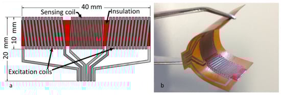Fluxgate sensor: (a) Schematic representation of the conception of the sensor with dimensions; (b) Photographic view of the fabricated flexible sensor.