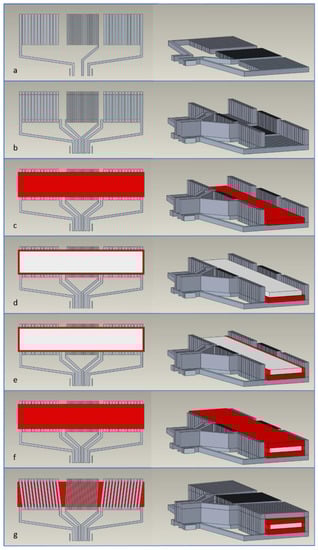 Schematic representation of the sensor after each fabrication step: (a) First step: printing the bottom conductive layer; (b) Second step: printing the conductive vias; (c) Third step: printing the bottom insulating layer; (d) Fourth step: the mounting and attachment of the magnetic core; (e) Fifth step: printing the insulating walls and (f) the top insulating layer; (g) Sixth step: printing the top conductive layer.