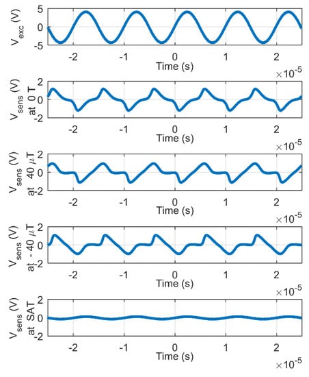 Waveforms of the fluxgate sensor with 700 mA p-p excitation current at 100 kHz: for the excitation coils (first signal) and for the sensing coil, respectively, at B = 0 T, B = +40 µT, B = −40 µT and at saturation.