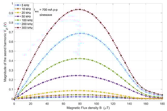 Magnitude of the sensor’s second harmonic response to the applied magnetic field at 700 mA p-p for 5–300 kHz excitation frequency range.