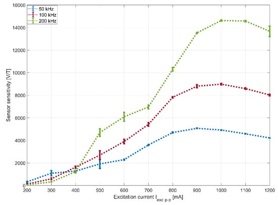 The resulting sensitivity curves are presented as a function of the excitation current in Figure 5. The maximum sensitivity is measured at 14,620 V/T at 200 kHz for 1000 mA p-p excitation current, which is among the highest reported for micro-fabricated sensors in the literature [3,7,29,30]. Here, it can be observed that the sensitivity of the sensor increases at higher frequencies. Furthermore, the sensitivity depends on the excitation current magnitude, climbing to a certain limit with increasing current. According to [3], these maximum values are shifted at higher frequencies due to eddy current losses in the magnetic core. When applying excitation currents of a lower magnitude, the sensitivity is measured to be slightly higher at lower frequencies. This may result from the temperature dependence of the static or dynamic properties of the magnetic core such as permeability, partial saturation and skin effect. The inhomogeneous increase of temperature along the core may result in inhomogeneous magnetic properties and a slight change of behavior. In addition, parasitic coupling effects can affect the behavior of the sensor. A more detailed explanation of this phenomenon requires further investigation.