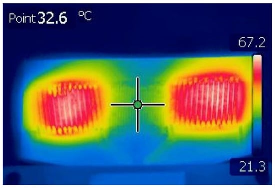 This section examines how the temperature of the sensor varies as a result of the excitation current. The temperature distribution of the sensor was measured using a FLIR T365 (FLIR Systems, Inc., Wilsonville, OR, USA) infrared camera, with ambient temperature at 20 °C. The sensor was placed on a 3D printed flat substrate with a thickness of 5 mm, composed of acrylonitrile butadiene styrene (ABS) filament. No passive or active cooling mechanisms were employed. Infrared measurements are based on the emissivity of the materials. In Figure 6. an infrared photograph with the temperature distribution on the sensor is presented. The temperature was measured with 700 mA p-p excitation current at 100 kHz. According to this figure, the temperature in the middle of the sensor, at the centre of the magnetic core is measured to be 32.6 °C, and the highest temperature that is dissipated from the excitation coils is 67.2 °C. The measured temperature from the excitation coils is dominant in this figure and corresponds to the surface temperature of the coils. On the other hand, the measured temperature in the middle of the sensor corresponds to that of the magnetic core, and thus can be considered homogenous for the entire thickness of the sensor at this particular point. Both measurements help to understand the way that the excitation current and frequency influence the sensor. In addition, the imperfections of the printing technique can be observed, since the excitation coils are not symmetrically heated by applying the same excitation current.