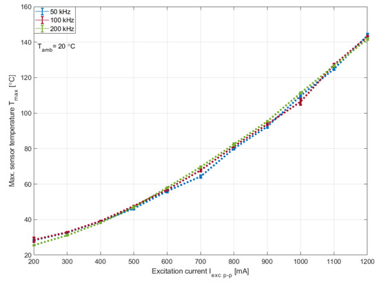 Maximum measured temperature of the sensor as a function of the excitation current.