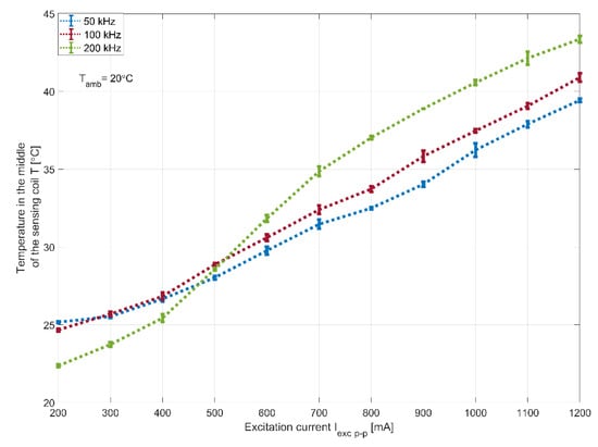 Furthermore, temperature measurements were taken using the infrared camera as a function of the excitation current for 50, 100 and 200 kHz. Figure 7 presents the maximum temperature that corresponds to the excitation coils and demonstrates where the curves for the different excitation frequencies are almost identical and their independence to the excitation frequency. Figure 8, however, presents the temperature measured in the middle of the sensing coil. These curves have a similar form to the sensitivity curves of Figure 5. At low currents, the measured temperature is higher for lower frequencies. However, as the excitation current increases, higher temperatures are recorded for higher frequencies. This reinforces previous assumptions regarding the increase in losses in the core under such conditions.