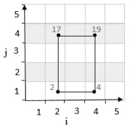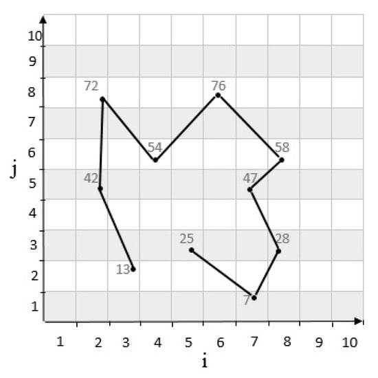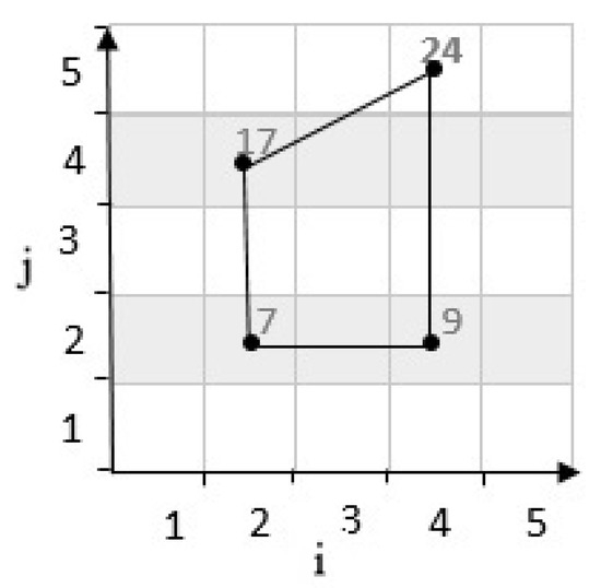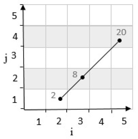 Third state: If the result of the determinant is zero, the third cell is placed on the line. So, it does not form a zone. For example, in Figure 8, considering cells have coordinates and in a grid cell with . According to Equation (1), are mapped to numbers 2 and 20. These two cells are connected by a line. Then, by calculating the determinants, the position of the third cell with the coordinates which is mapped to 8, and it is determined as follows: