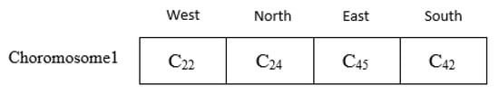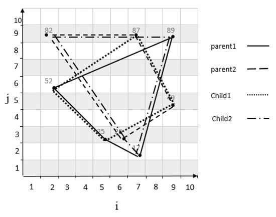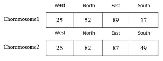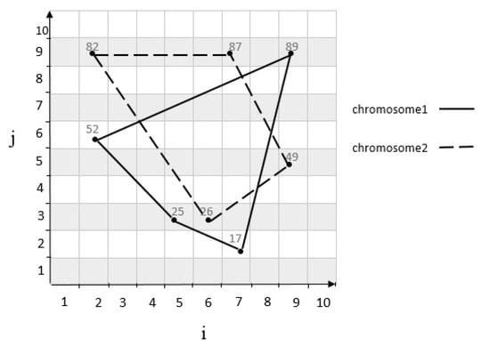 The genetic algorithm generates an initial population in search of the optimal traffic zone. The initial population is equal to the number of cells randomly selected to meet the demand of their traffic control. Also, the limitations must be applied to the selected cells. Thus, the parent chromosomes are selected from the initial population . For example, suppose we have a grid cell with as shown in Figure 9, two sets of parent chromosomes are selected with length 4 from the initial population . A chromosome 1 genes contains following cells: by using the relationship in Equation (1), the coordinates of each cell is mapped to a numerical value of 25, 52, 89, 17. Also, chromosome 2 genes contains following cells: is mapped to a numerical value of 26, 82, 87, 49. Also, the scope of both chromosomes is shown in Figure 10. The following is a series of mechanisms that modify the initial population to obtain optimal algorithm solutions.