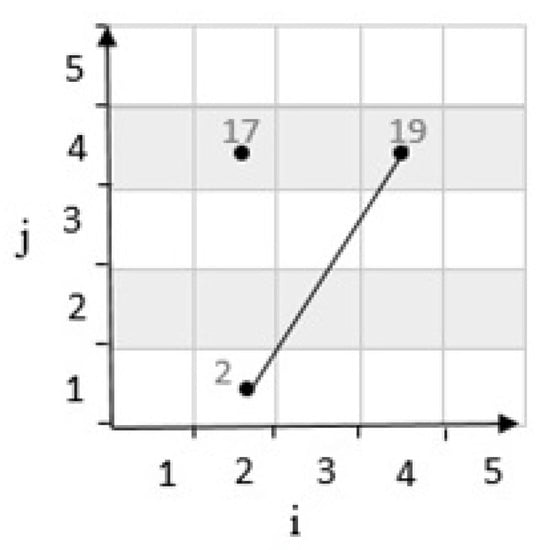 First state: If the result of the determinant is positive, it means that the third cell is located on top of the line. For example, considering cells with coordinates and on a grid cell with in Figure 4. According to Equation (1), are mapped to numbers 2 and 19. These two cells are connected by a line. Then, by calculating the determinants, the position of the third cell with the coordinates which is mapped to 17, and it is determined as follows: