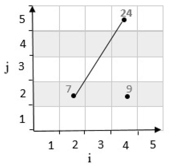 Second state: If the result of determinants is negative, the third cell’s location is placed on the bottom of the line. For example, in Figure 6, considering cells have coordinates and in a grid cell with . According to Equation (1), are mapped to numbers 7 and 24. These two cells are connected by a line. Then, by calculating the determinants, the position of the third cell with the coordinates which is mapped to 9, and it is determined as follows: